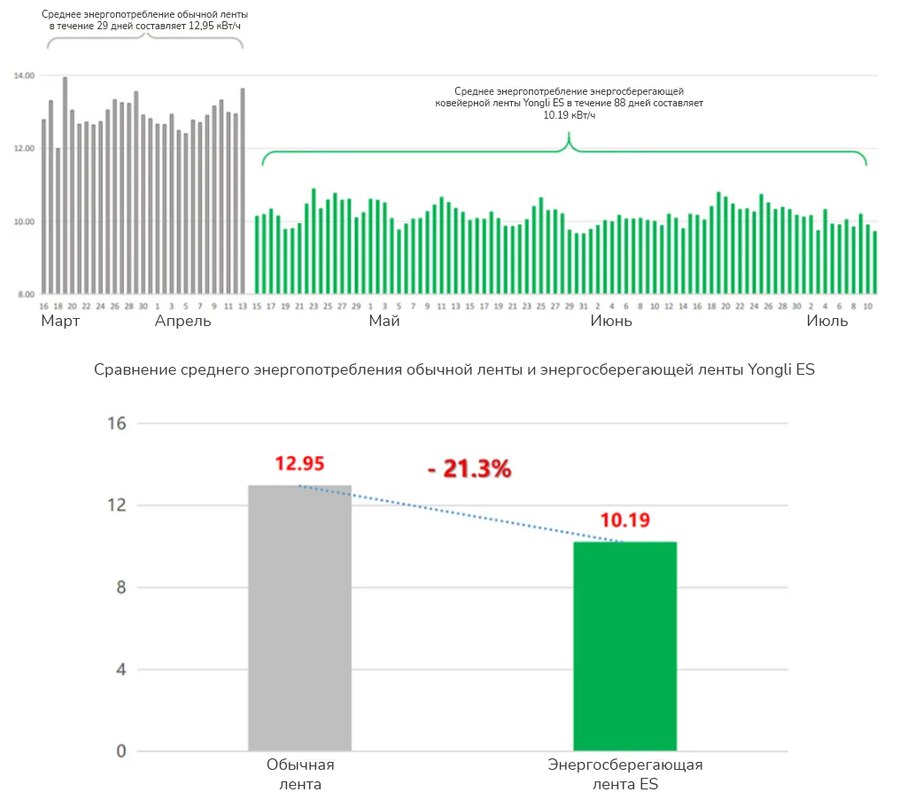 - После 88 дней испытаний конвейер с энергосберегающей лентой ES потребляет в среднем 10,19 кВт/ч в день . По сравнению с потреблением энергии конвейером с обычной лентой экономится 21,3% энергии;